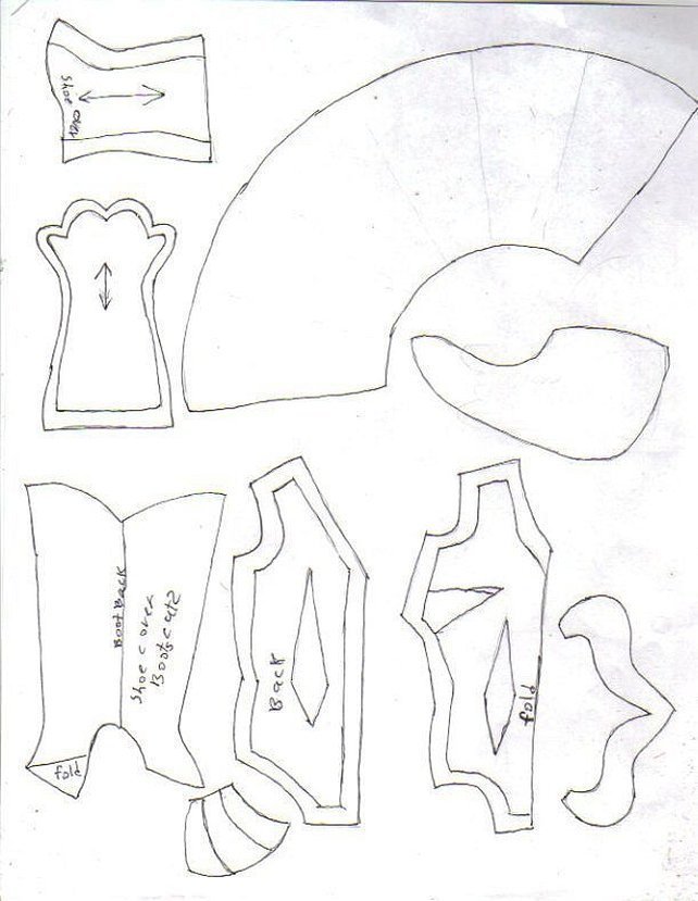 Комбинезон выполняется в пять этапов: вначале создаются выкройки по приведенным ниже шаблонам с припусками, затем они сметаются и сшиваются вместе. После созданное изделие декорируется фурнитурой. Важно в момент создания комбинезона обязательно обработать все детали выкройки при помощи зажигалки. Также стоит учесть припуски на швы в размере 1-2 сантиметра.