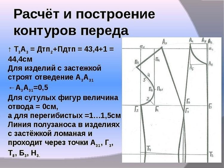 Например: формирование плечевой вытачки необходимо из-за различий в фигурах, сутулым фигурам размер потребуется больше, чем людям с прямой спиной. Для ее построения на груди необходимо найти следующие мерки: