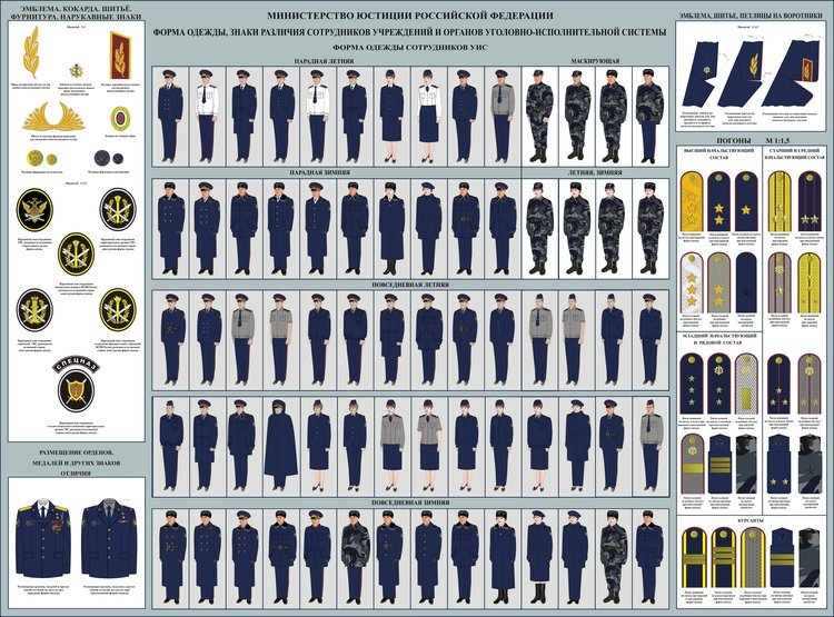 Работники ФСИН обязательно имеют несколько различительных знаков: общие нашивки, которые подходят для всего СИН, и указывающие на конкретное подразделение. Общая эмблема имеет овальную форму. Размещаются они на груди и правом рукаве снаружи. На левом рукаве помещаются знаки отличия людей, которые работают в центральном аппарате, территориальном органе, учреждении УИС и учебном заведении ФСИН. Цвет знака может быть представлен на сине-белом или сине-сером фоне. Представители Спецназа носят дополнительную нашивку 27 на 7 сантиметров над шевроном, который соответствует подразделению. Крепятся знаки отличия при помощи классического пришивания и липучки.