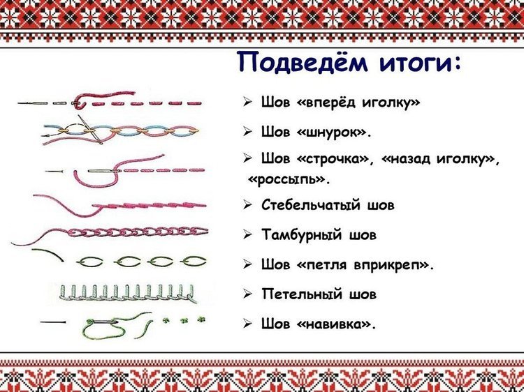 Есть другая классификация. Швы бывают стачивающими, стачивающе-обметочными, подшивными, стегальными, наметочными, разметочными, выметочными, вспушными, копировальными, петельными, закрепочными, пуговичными и отделочными.