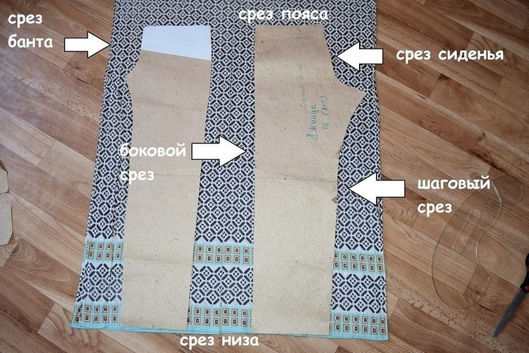 Предварительно нужно определиться с правильным положением лекал. Направление основных нитей должно располагаться по направлению к низу штанин.