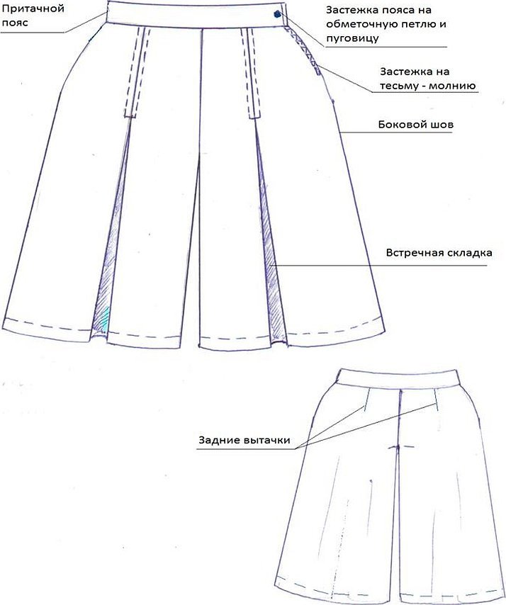 Если нет готовой выкройки под юбку-шорты, то лекало можно срисовать с обычных старых изделий. Можно также использовать эскиз брюк, только для начала укоротить его до необходимого размера.