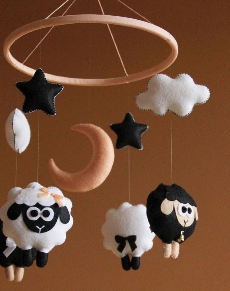 В магазинах продаются самые разные модели, которые способны проигрывать колыбельные или вращаться, а также светиться. Они имеют разные размеры, изготовлены из всех доступных материалов, выполнены в разных стилях. Но ребенку будет не менее интересна фетровая подвеска с небольшими фигурками.