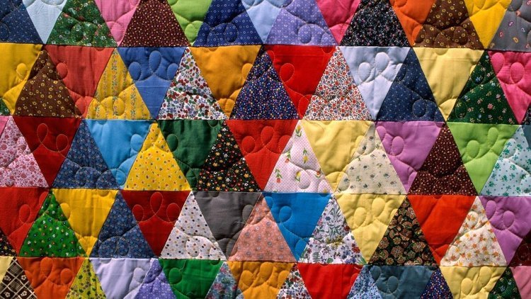 Треугольный стиль. Из старого материала вырезаются равнобедренные треугольники, которые сливаются по коротким сторонам и образуют пестрые полоски.
