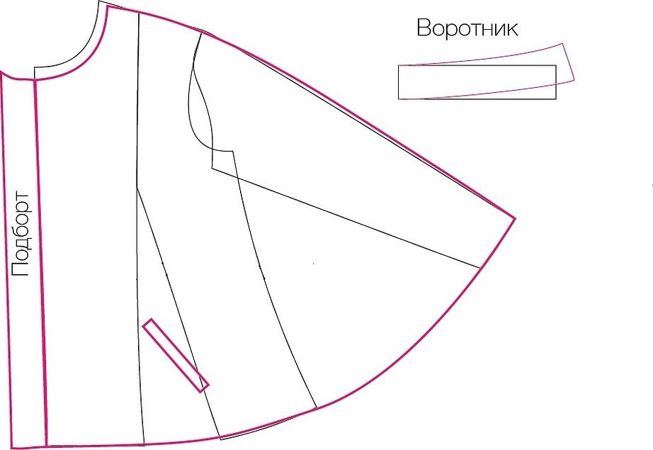 В этой модели изделие кроится из трех основных деталей со швами: спинка и две детали полочки с застежкой по борту. Горловина оформляется воротником-стойкой или простым кантом.