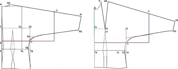 Удлинить плечевую линию, отложив на ней длину плечевого ската и длину рукава в готовом виде.