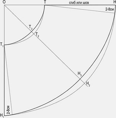 Прочертить вторую окружность. Радиус вычисляют по R, прибавив к нему значение длины изделия + пару сантиметров.