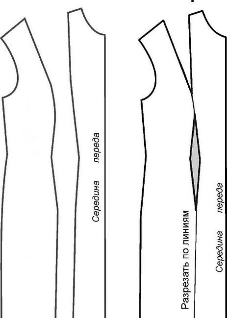Разрежьте спинку вдоль рельефа, промерьте длину изделия по боковой линии спинки и отложите эту величину спереди, тоже на боку.