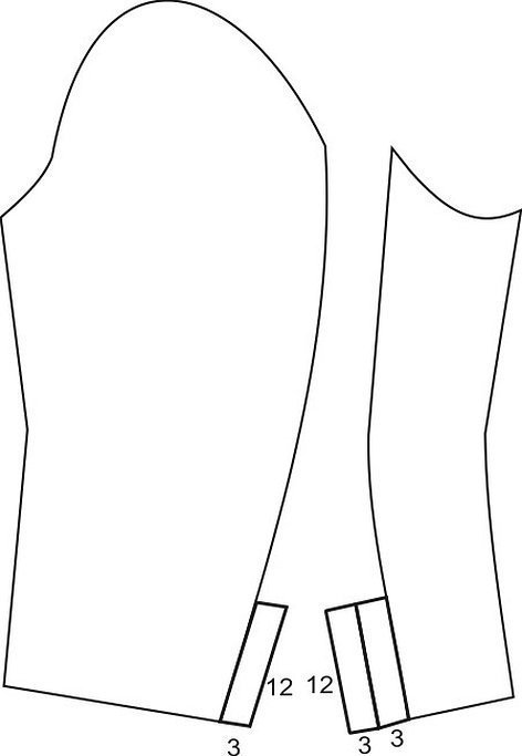 Если после моделирования обхват талии слишком маленький, можно уменьшить вытачку на ней (в рельефном шве). На застежку добавляют 3 см (заход) и 7 см для лацкана. Его линия вычерчивается по лекалу, как и очертания низа и борта. На рукавах делается прибавка для шлицы — в верхней части 4х10 см, а по локтю 8х10 см (ширина и длина).