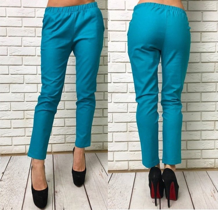Из хлопчатобумажной ткани, которая хорошо держит форму, можно сделать офисные или вечерние брюки. Резинка, аккуратно вшитая по линии талии, прилегающий крой и зауженный низ придадут изделию строгость и классичность.