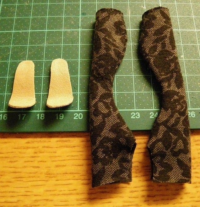 - Приложить картонную заготовку к стопе куклы и, надрезав край сапога, приклеить ее к подошве.