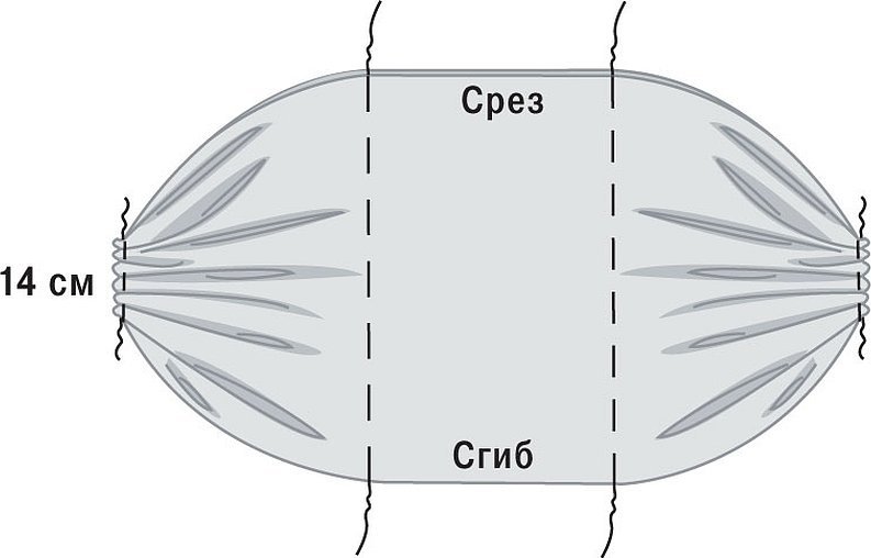 модель с круговыми односторонними складками — расстояние между складами выбирают произвольно, их размеловку делают после стачивания полотнища (кроме одного шва);
