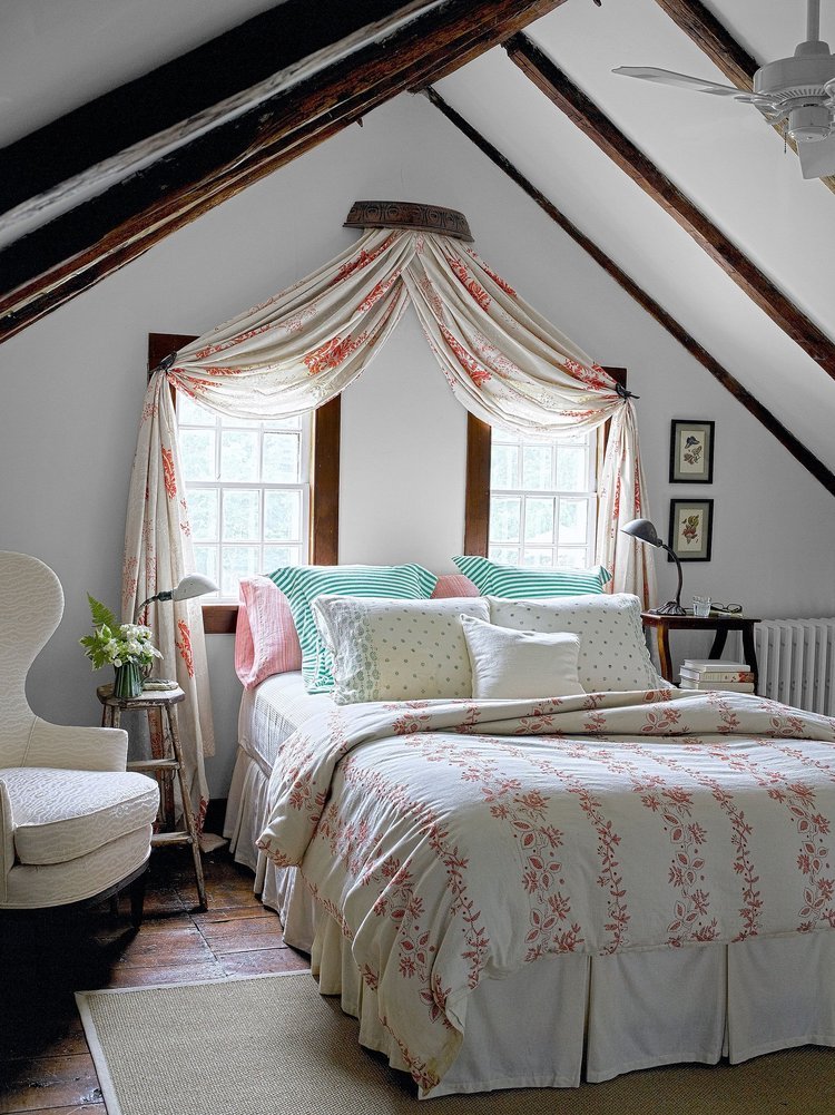 Королевский выход. Вместо того, чтобы повесить занавески на каждое маленькое окно, создайте необычный навес, который разделяется надвое. Создать его можно из небольшого карниза, зажима в углах рам и длинных полос ткани (шторной или любой другой). Данная альтернатива классическому размещению штор подходит для двух окон рядом и особенно хорошо показывает себя при оформлении спальни.