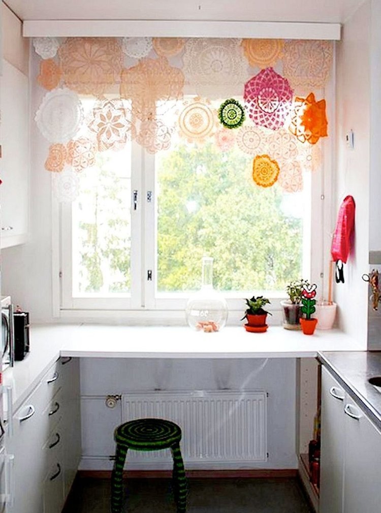 Кружевные заплатки. Красочные и женственные, эти занавески на половину окна было легко сделать из кружевных салфеток и нескольких красителей. Все можно найти в бытовом магазине. Салфетки сшиваются капроновой нитью или приклеиваются, сверху возможно просунуть кольца, а лучше сделать петельки, чтобы подвесить их на карниз. Цвет, интенсивность, размер конструкции — все на ваше усмотрение.