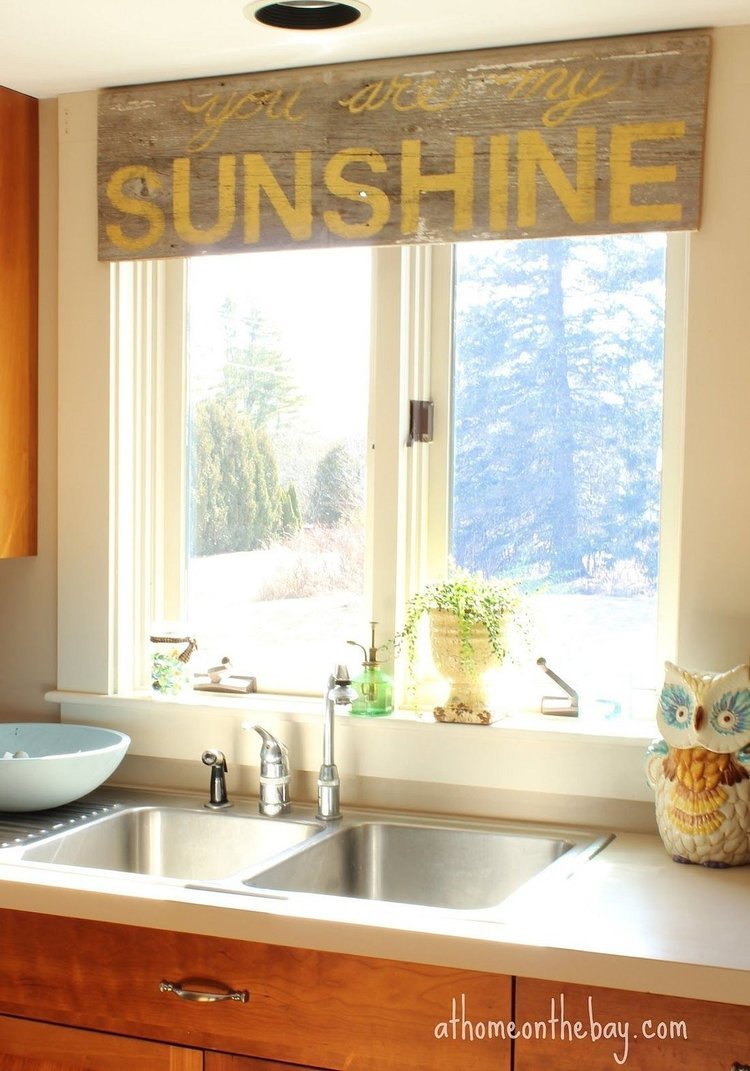 Пустите свет вовнутрь. Без полного перекрытия окна, повесьте только ламбрекен или, что более креативно, какую-то вещь в качестве альтернативы шторам. Это может быть прибитая доска с веселой надписью, постер, цветочная или книжная полка и многое другое. Основной смысл идеи — оставить ⅘ окна открытыми.