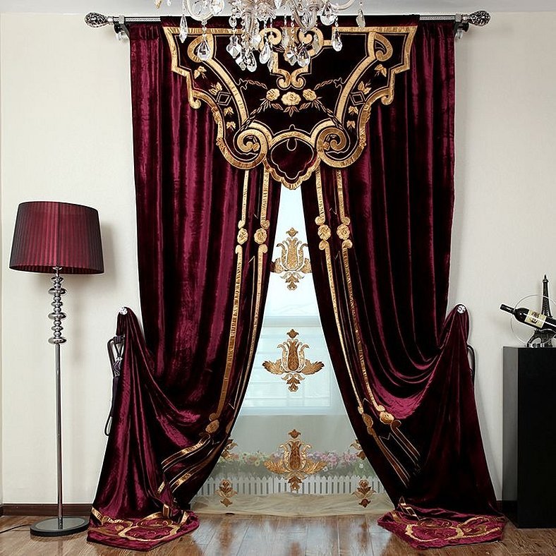 Состав должен быть сложным. Шторы расставляют во множество рядов с великолепной драпировкой, не лишним будет ламбрекен замысловатой формы.