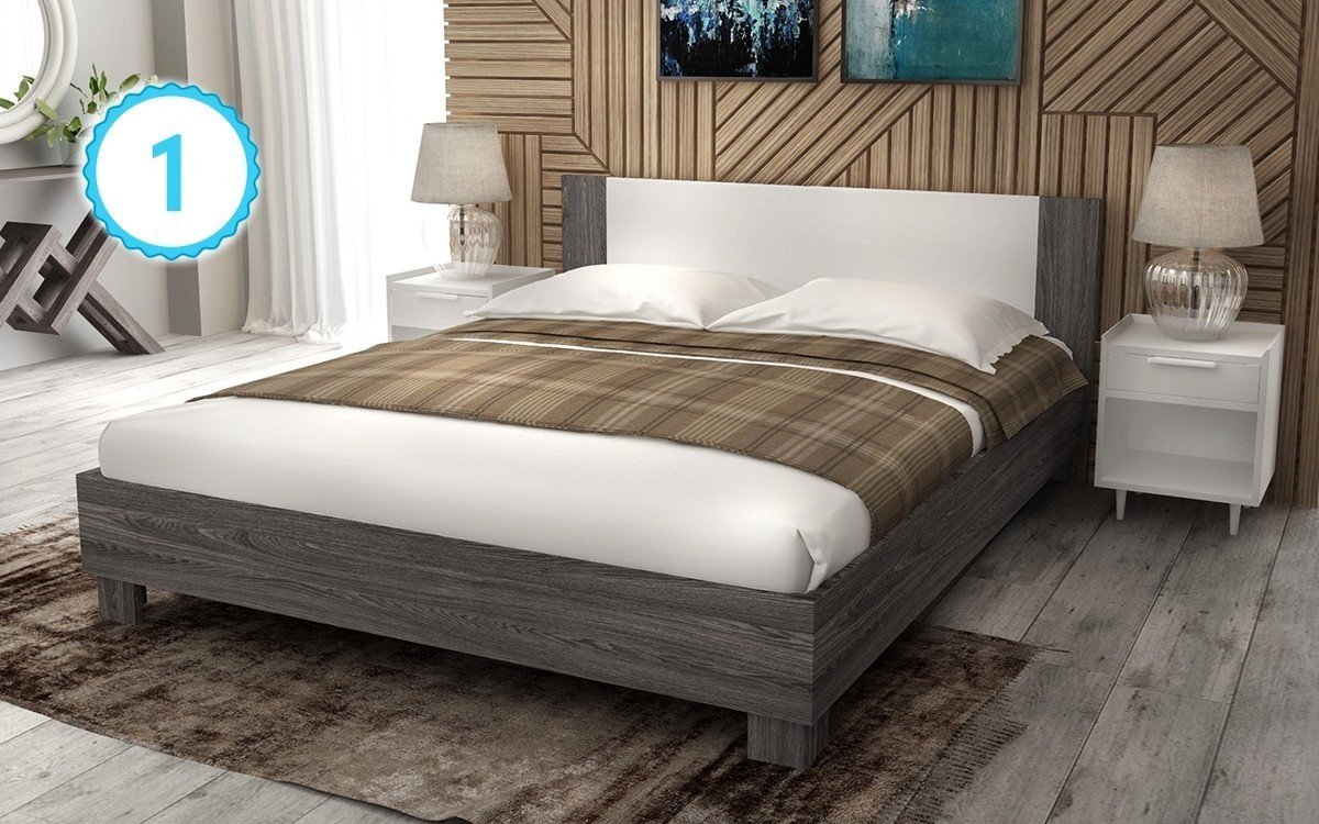 Фасады и царги кровати выполнены из ЛДСП. Основание покупатель выбирает на свое усмотрение. Оно может быть представлено широкими или узкими ламелями, с ножками или без них. Чтобы придать своему ложу дополнительную прочность, можно заказать основание в металлической раме. В прямоугольном изголовье кровати высотой 78 см сочетаются два вида ЛДСП разных оттенков. Ножки модели, изготовленные в цвет основы, обладают высотой 5 см.