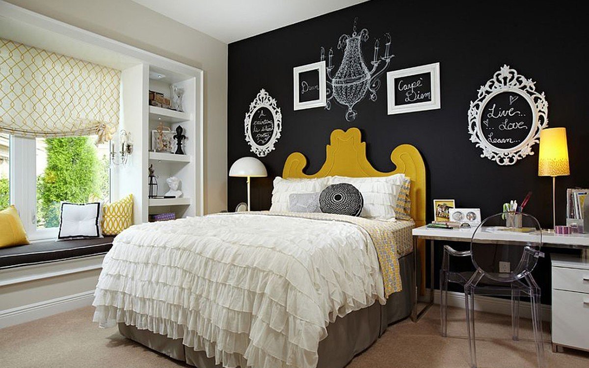 Грифельная стена – одновременно декоративный и рабочий элемент интерьера. Решение появилось в обиходе уже несколько лет назад, но до сих пор выглядит актуальным, особенно для спальни. Грифельной доской можно оформить только часть изголовья. Либо разместить ее за кроватью большим колор-блоком на всю стену, который модно контрастирует со спокойным окружением комнаты. Ну и, главное – с такой стеной хоть каждый день можно менять настроение спальни, оставляя новые рисунки и послания. Из недостатков: перед очередным творческим порывом стену нужно тщательно мыть, так как меловые следы создают ощущение грязной поверхности.