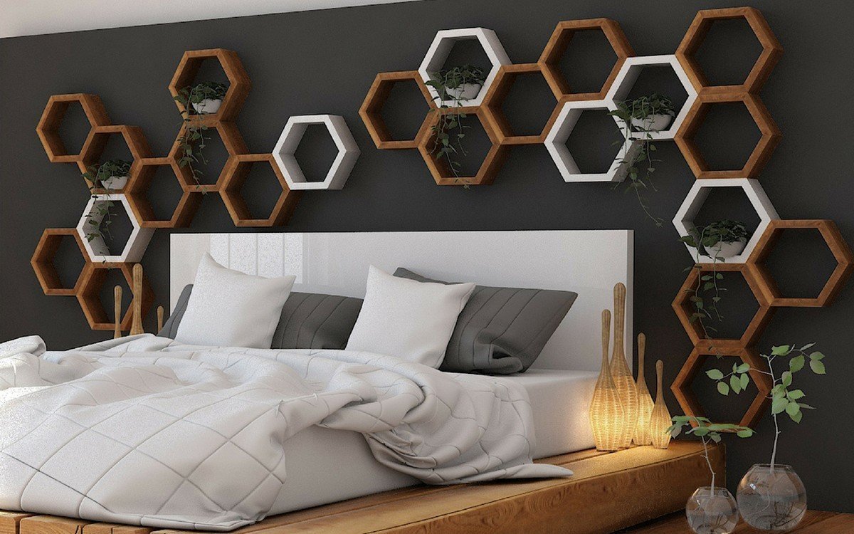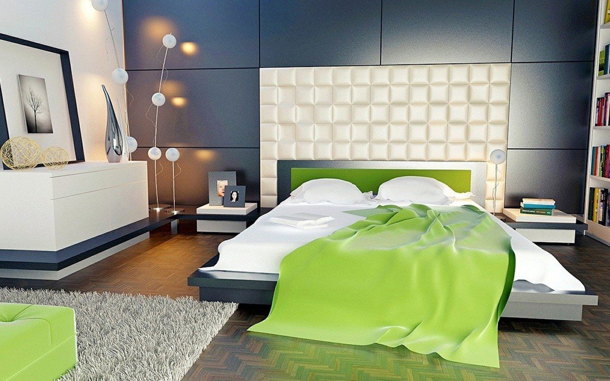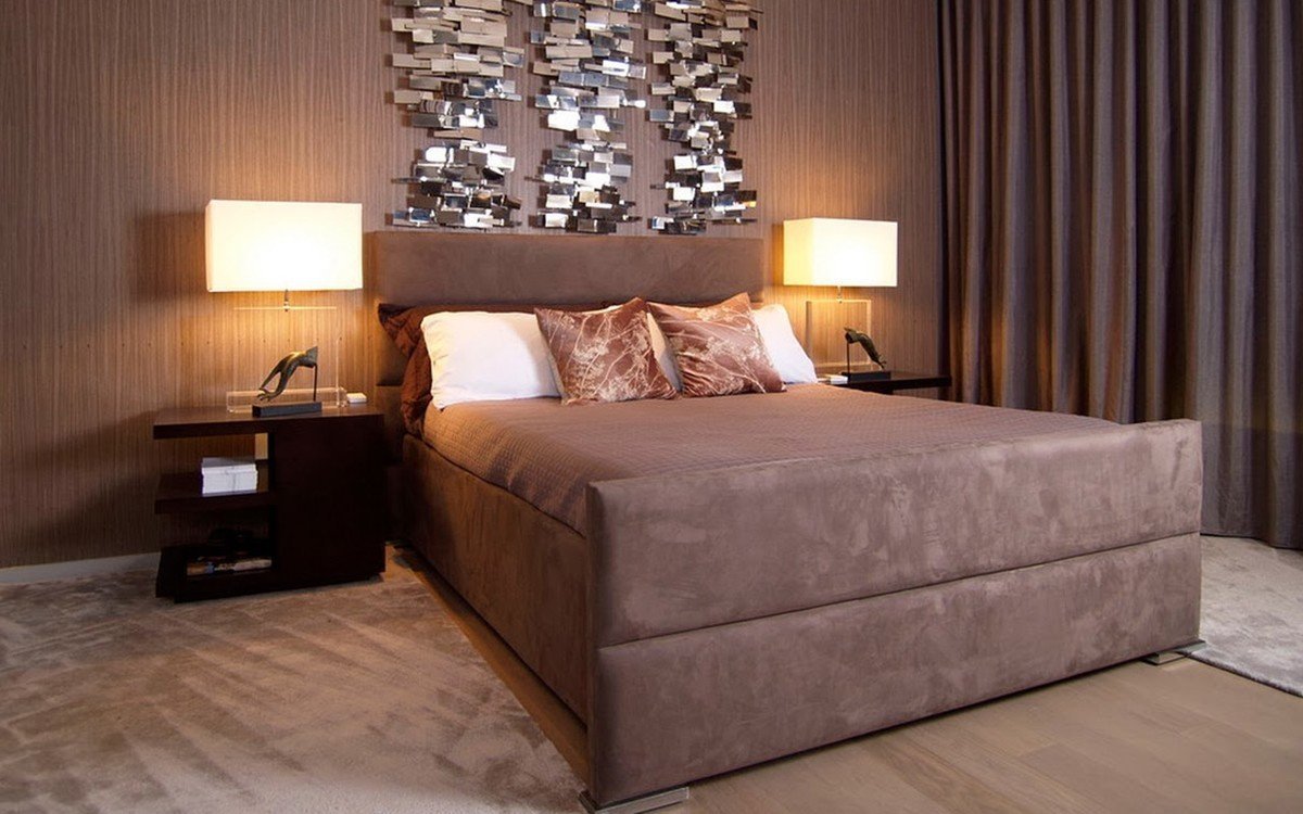 3d-панели – чаще всего представляют собой алюминиевые конструкции, закрепленные на обрешетке. Панели покрывают разными материалами – кожей, пленкой, фанерой, краской – в зависимости от того, какой оригинальный объемный эффект хотим получить. В итоге, над кроватью можно создать иллюзию огромной шоколадной плитки, песчаного пляжа, Лего-фигур, плетения, кирпичной кладки – практически любой текстурной поверхности. 3d-панели хорошо моются, долго служат, обеспечивают звукоизоляцию. А если выбрать более дорогой вариант из дерева, то в спальне появится практически природная зона.