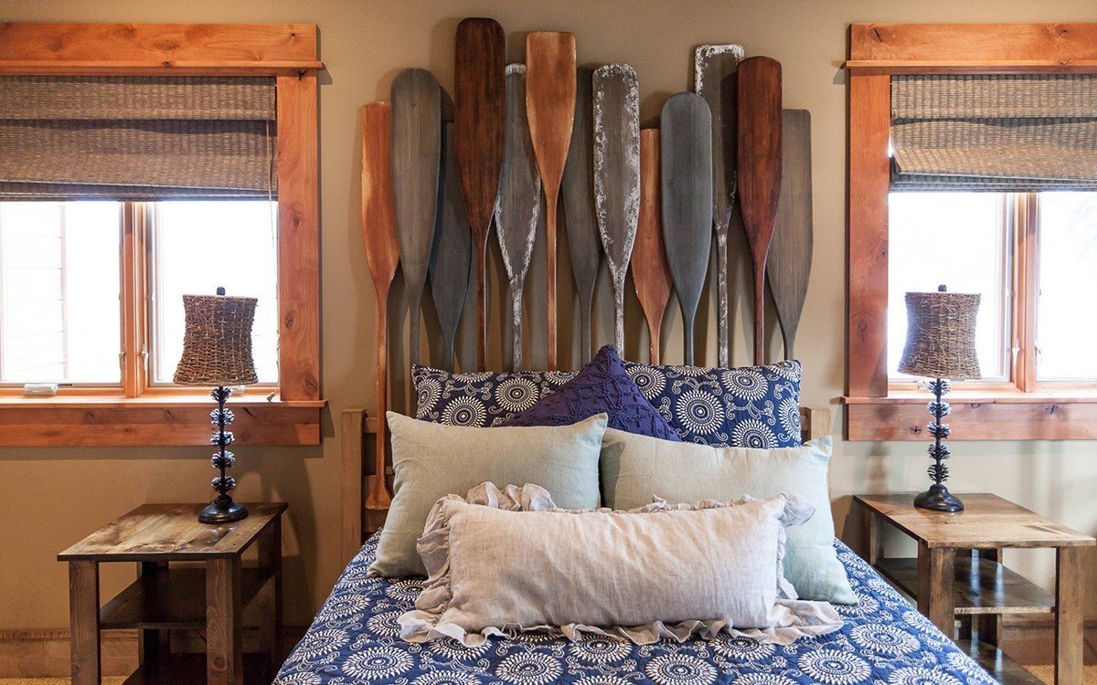 Предметы хобби – если скопились старые журналы и книги, хоккейные клюшки, тарелки, кружки, жестяные банки, корзины, открытки и другие предметы, которые вы собираете или которыми постоянно пользуетесь, все можно пустить в оформительское дело. Зону над кроватью украшают даже старыми веслами, шляпами и теннисными ракетками. Чем не проявление бережного отношения к миру.