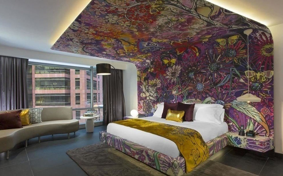 Окрашивание и обои – еще один классический и доступный способ оформить изголовье. Стену за кроватью выделяем контрастным цветом из остального периметра и визуально обозначаем территорию сна. При выборе орнамента, учитываем, что вертикальные элементы лучше продолжить прямо в стык с потолком и зрительно увеличить высоту стен. А горизонтальные линии расширяют пространство, но выбирая полосы, не мельчим: они могут быть разными по ширине, но не узкими – так комфортнее глазу. Для небольших квартир, где нет возможности организовать отдельную спальню, удобным вариантом зонирования станет единое оформление стены и потолка над кроватью. Обои клеим на стену и продолжаем полотно на потолок.