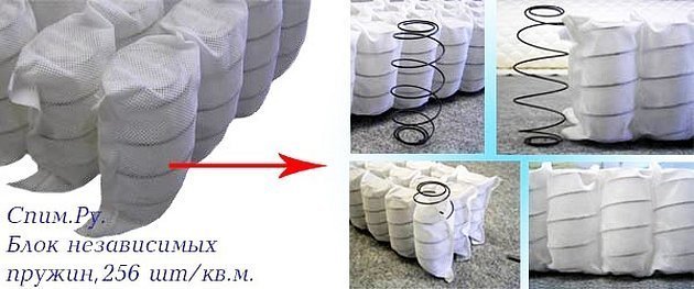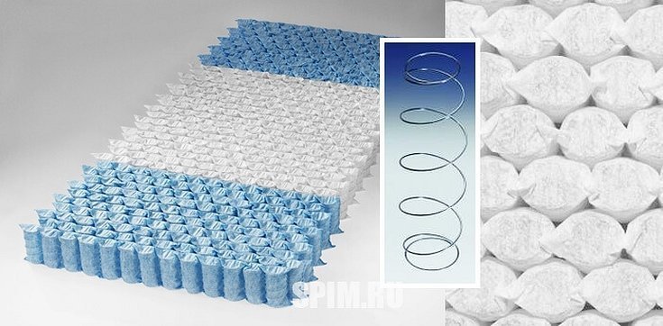 Особенность технологии - это то, что каждая пружина не соединена ни с одной другой, и соответственно работает отдельно, сама по себе. Это и обуславливает хорошую точечную эластичность матраса. Т.е. матрас хорошо прилегает к телу, огибает все его изгибы. Самым распространенным вариантом таких пружинных блоков являются блоки плотностью 256 пружин на кв.м. Пружины имеют 5 витков, высота блока - 12 см.
