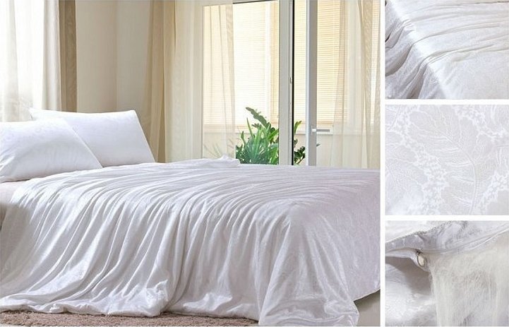 Это выбор практичных людей, ценящих качество и достойную цену. Настоящая находка для спальни — шелк летом прохладный, а зимой теплый. Изделия изготавливаются из стопроцентного натурального шелка «Тусса». Покрывало прекрасно впитывает влагу и испаряет ее. Так что спящий человек не будет потеть и не замерзнет.