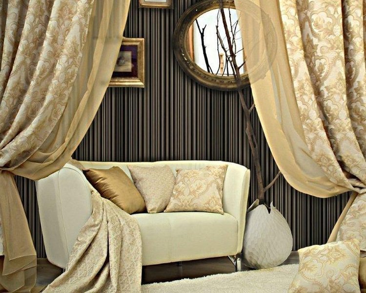 Шторы изготавливаются из необычных материалов. Используется бархат с оттенком капучино.