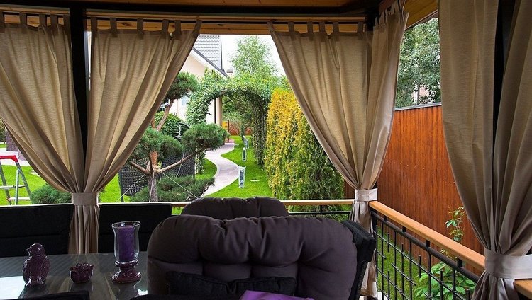 Подчеркнуть достоинство или респектабельность владельца шатра или беседки можно легкими воздушными тканями, подобными кисее или вуали. Собранные особым образом в драпировку шторы из органзы, оксфорд или акрила сохранят тепло внутри и скроют внутреннее пространство от любопытных глаз.