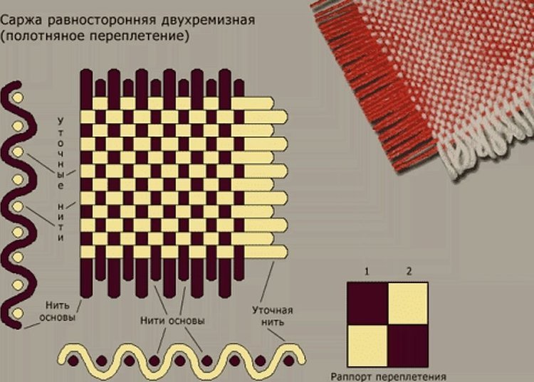 Рапорт имеет минимум 3 нитки. В переплетении полотняным образом встречается только 2. Количество нитей в тканях здесь является решающим, так как полностью меняет качество итогового полотна.