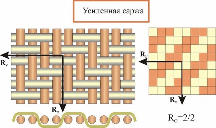 Саржевое переплетение имеет много сходств с предыдущим типом. Однако есть 2 основных отличия: