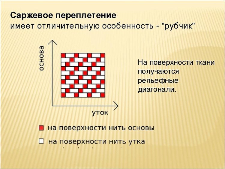 саржевое переплетение нитей — несимметричный сдвиг при перекрещивании волокон;