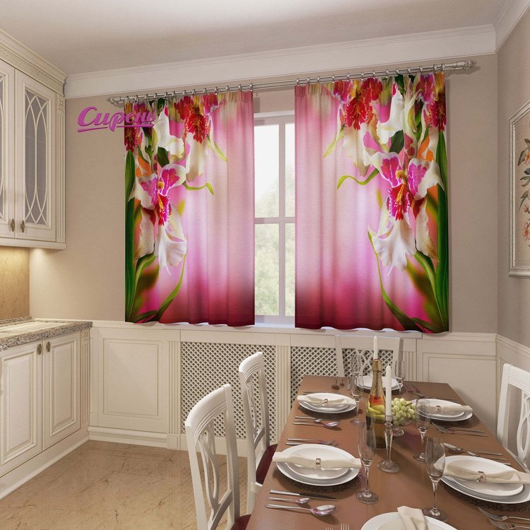 Обычно кухонный тюль не очень большой длины. Чаще всего этот элемент декора падает на подоконник, но может быть и до пола. Это связано с тем, что обычно перед окном на кухне стоит гарнитур, батарея — это может быть рабочий стол хозяйки, мягкий уголок и т.д. Часто на подоконники кладут цветы — они являются прекрасным украшением кухни. Чтобы обеспечить достаточный уход за растениями, удобнее иметь короткий тюль для кухни. Даже дверь может быть препятствием для длинного тюля, так как балконный выход, сквозняком может «утаскивать» ткань на улицу.