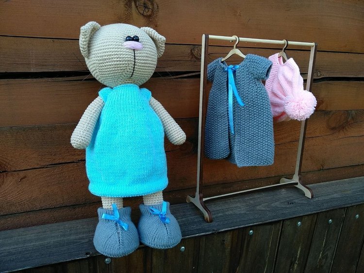 Подбор отделочной фурнитуры для гардероба куклы ограничен только собственной фантазией мастерицы. Для оформления наряда можно взять кружевные и атласные ленты, всевозможные пуговки, бусины и бисер. При желании голову вязаной зверушки можно украсить объемной шевелюрой из ниток или готовых искусственных прядей.