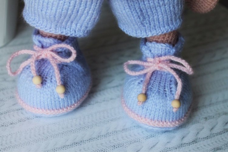 Еще один важный элемент куклы тильды – это обувь. Самый простой вариант – связать ботинки. Для этого понадобится пряжа другого цвета. Техника вязания аналогичная стопам. Только с середины работы используют спицы, создавая изнаночные и лицевые петли.