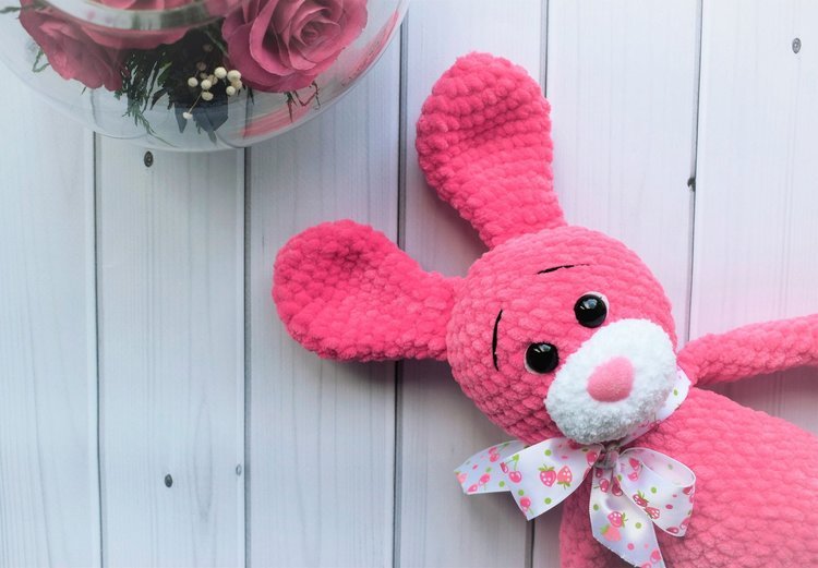 Объемные уши стянуть по нижнему краю и пришить к голове. Розовый понпон расположить на месте хвоста и закрепить простой ниткой.