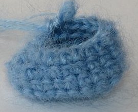 Приступать к вязанию нужно с головы фигурки. Взять голубой мохер и набрать 2 воздушные петли. Через вторую связать 6 столбиков без накида.