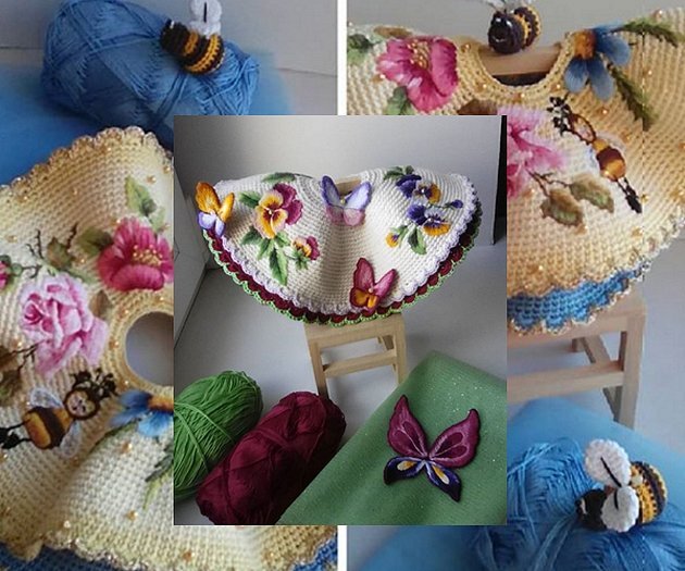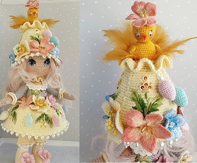 Блёстки, пайетки, вышитые и вязаные пейзажи, украшающие наряд, букетики, причёски, шляпки и украшения у каждой куколки свои, персональные. По высоте куколки немного (на несколько сантиметров) превышают размер вертикально расположенного мотка пряжи, из которой изготовлены.