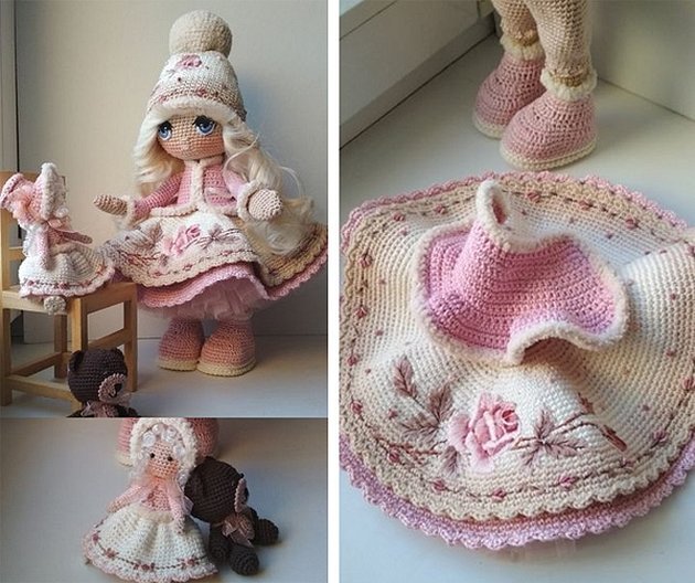 Куклы Ольги Архиповой, вязаные крючком — это, скорее, выставочные модели, чем игрушки. Уникальными её работы делает наличие множества мелких художественных фрагментов и кропотливая проработка мельчайших деталей.