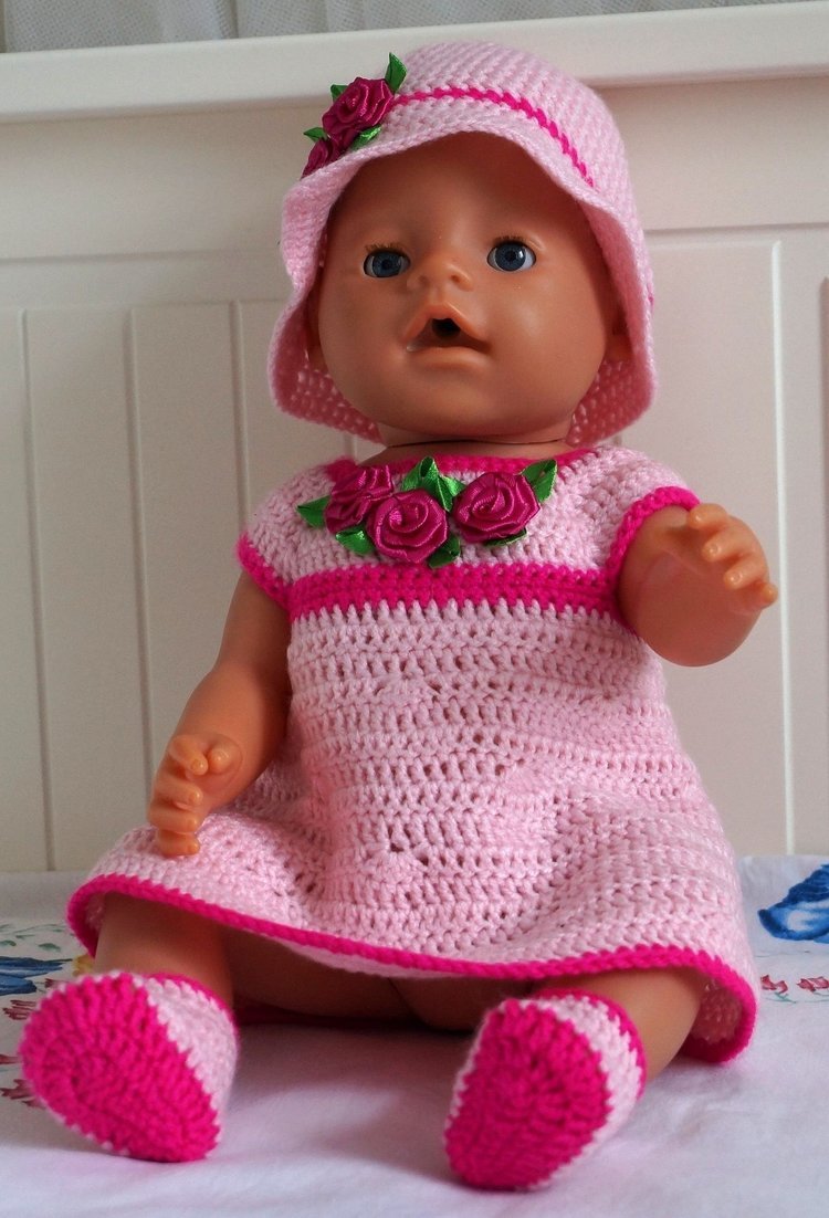 Бэби-бон – это самая любимая игрушка детей. Куколки в виде младенцев давно покорили сердца малышей и их родителей. Для таких игрушек прекрасно подходит одежка, которая свойственна новорожденным: вязаные боди и комбинезоны, ажурные штанишки, крошечные переточки с бантиками и т. д. Мелкий декор в виде бретелек, ленточек и крошечных цветочков, также можно провязывать тоненьким крючком.