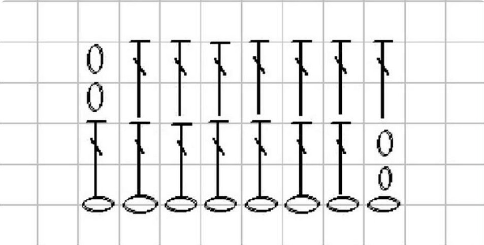 Мерки снимаются по талии куклы, после набирается необходимое количество петелек. Описание провязки первого ряда указано на схеме выше. После следует продолжать вязку каждого столбика с помощью одной накидной петли. Чтобы получилась резинка, данную процедуру следует выполнить 4 раза.